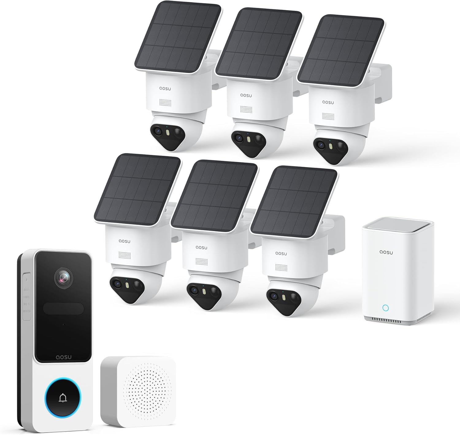 The aosu T2 Ultra 4K is a comprehensive, solar-powered wireless outdoor security camera system designed for homeowners who want robust surveillance without the hassle of wiring, monthly fees, or compromised privacy. The kit includes six 4K pan-tilt dome cameras, a 2K wireless doorbell camera, a smart chime, and the aosuBase—a central hub that manages all devices, stores footage locally, and enables advanced features like multi-camera tracking and AI detection.